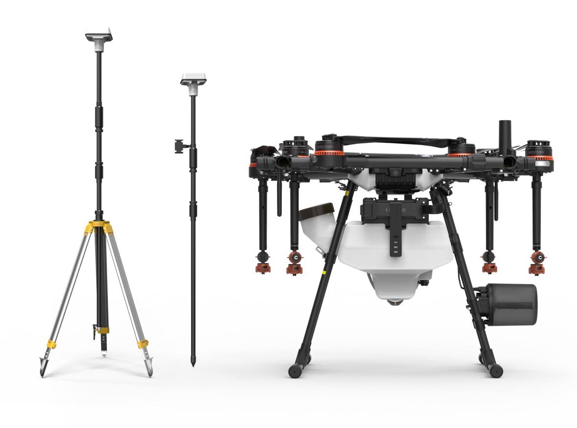 The MG-1P RTK is powered by DJI’s high-precision D-RTK navigation and positioning technology which offers centimeter-level positioning that is essential for industrial applications. Dual-antenna direction finding technology gives strong resistance against electromagnetic interference, ensuring flight safety even when the aircraft is flying near high-voltage power lines or in other complicated environments.The MG-1P RTK works in tandem with a new base station and D-RTKTM handheld mapper,[3]which receives positioning data from the onboard RTK module to accurately measure fields and transmits results to the remote controller for precise planning.