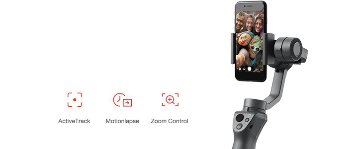 มาพร้อมกันสั่น 3 แกน และปุ่มควบคุมการถ่ายวิดีโอผ่าน Smartphone ทำงานร่วมกับ Application DJI Go ซึ่งมีฟีเจอร์การถ่ายต่างๆมากมาย อาทิ Active Track ติดตามวัตถุหรือบุคคล, Slow-Mo, Hyperlapse, Motionlapse, Timelapse เชื่อมต่อผ่าน Bluetooth LE 4.0