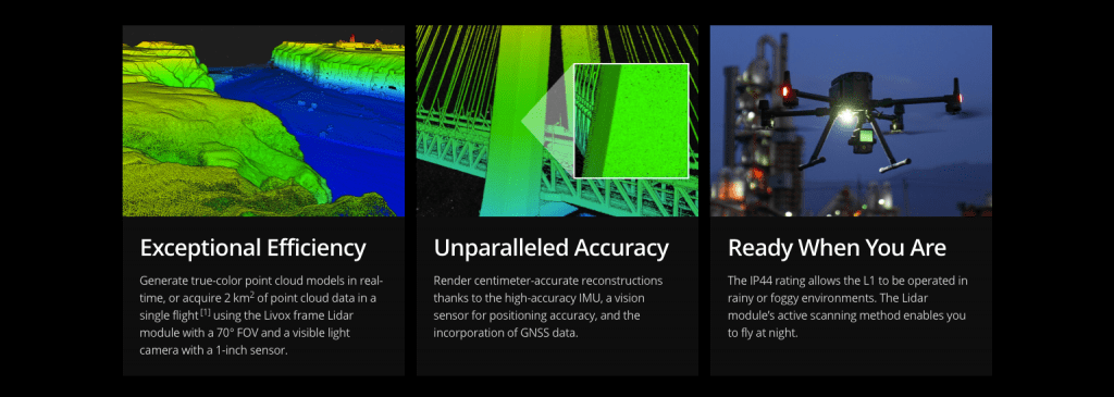 Zenmuse L1 ผสานรวมโมดูล Livox Lidar, IMU ที่มีความแม่นยำสูงและกล้องที่มี CMOS ขนาด 1 นิ้วบน gimbal ที่มีเสถียรภาพ 3 แกน เมื่อใช้กับ Matrice 300 RTK และ DJI Terra L1 จะเป็นโซลูชันที่สมบูรณ์แบบที่ให้ข้อมูล 3 มิติแบบเรียลไทม์ตลอดทั้งวันจับรายละเอียดของโครงสร้างที่ซับซ้อนได้อย่างมีประสิทธิภาพและส่งมอบโมเดลที่สร้างขึ้นใหม่ที่มีความแม่นยำสูง